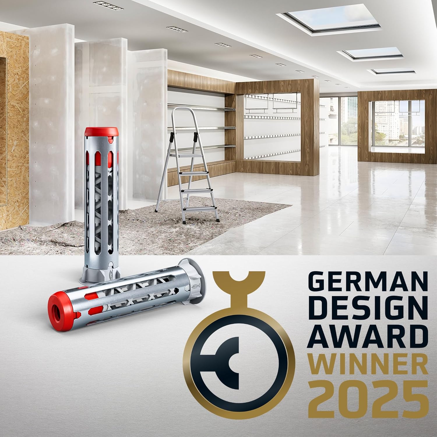 • Instalación sencilla: con tornillo TX para un montaje rápido y fiable. En el montaje previo, el casquillo de metal se pliega detrás del material de construcción y se presiona contra la parte posterior de la placa, mientras que el taco de plástico se extiende en el material de construcción, el montaje se realiza rápida y fácilmente mediante un destornillador inalámbrico, lo que reduce el tiempo de montaje hasta un 50% en comparación con los tacos convencionales.