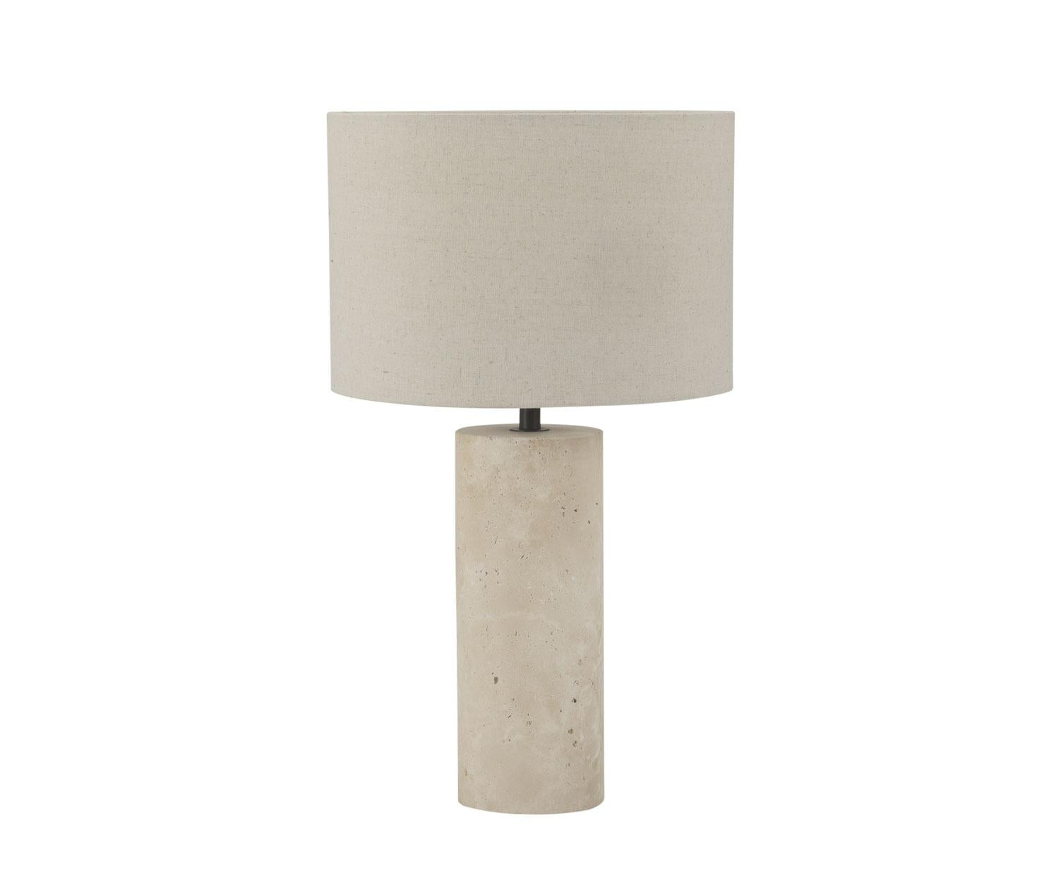 Lámpara decorativa Glow de Andrea House con base de travertino natural y pantalla de lino beige, diseñada para crear una luz suave y ambiental en salones, dormitorios o espacios de lectura. Su estética orgánica aporta calidez visual y textural a cualquier rincón del hogar.