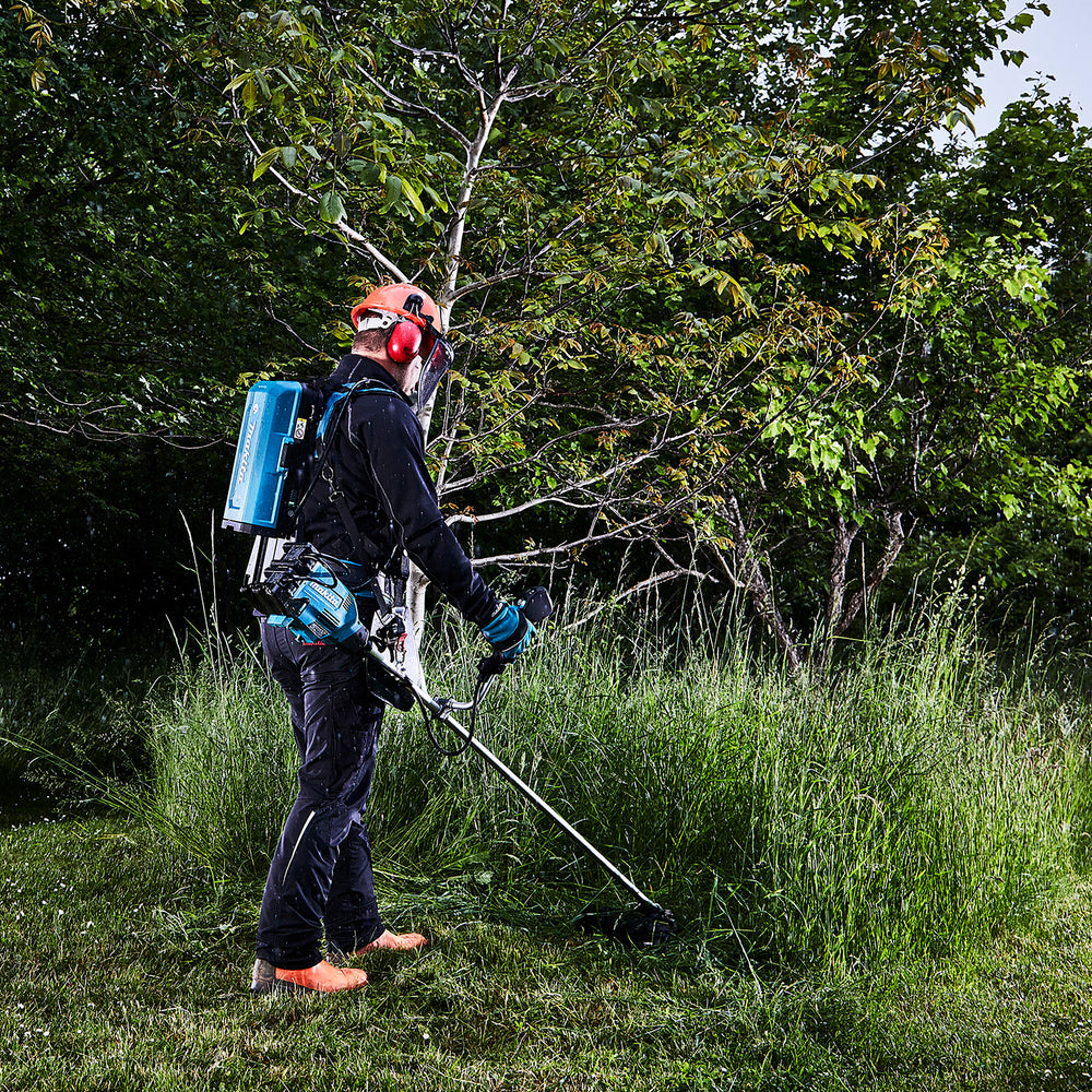 El pack de energía se asienta bien en la espalda y de esta manera hace que el trabajo sea cómodo y proporciona un mayor tiempo de funcionamiento de la herramienta. La mochila también puede utilizarse como mochila estacionaria si se desmonta el arnés de la mochila.