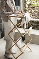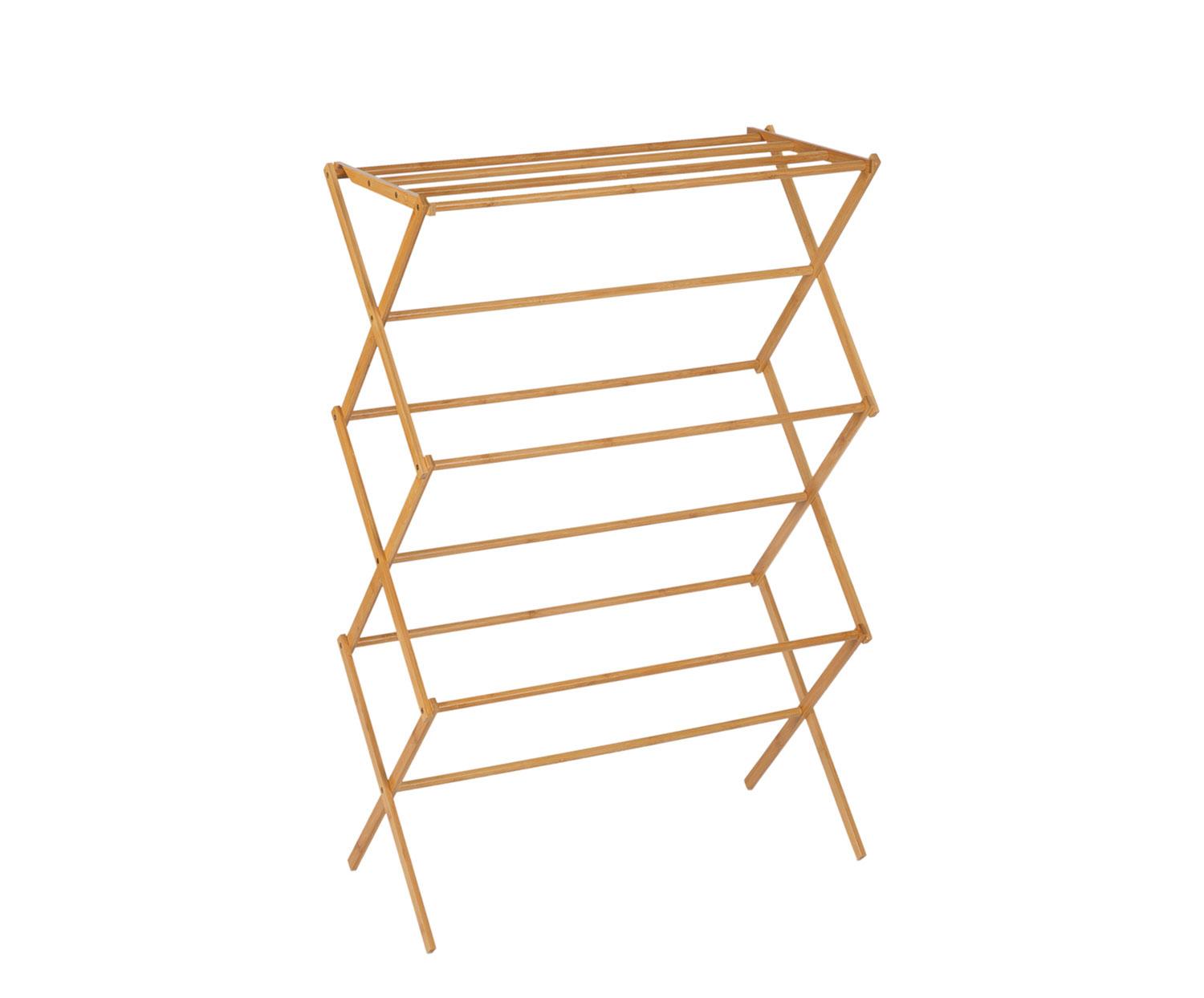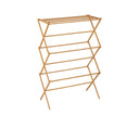 Tendedero plegable de madera bambú natural de estilo nórdico, diseñado para secar ropa de forma eficiente en espacios reducidos. Su estructura alta y estrecha facilita colgar tanto prendas pequeñas como piezas más grandes, optimizando el uso del espacio en interiores sin necesidad de montaje.