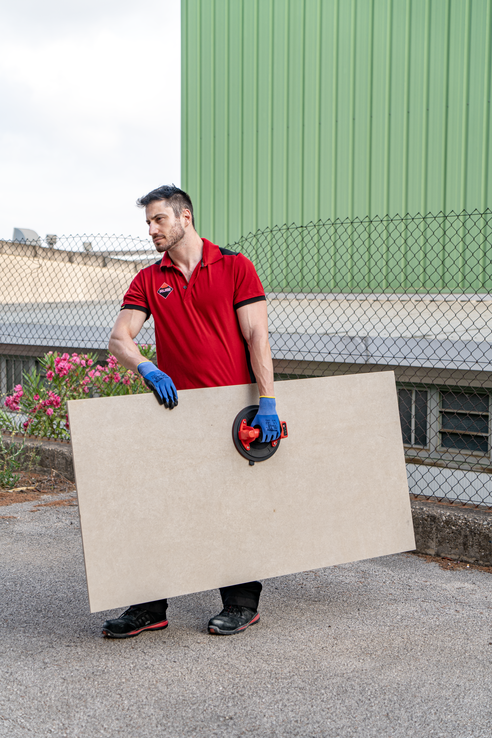 Ventosa a batería diseñada para la manipulación de baldosas cerámicas. Batería de 3.7V / 2 Ah integrada en la ventosa y carga a través de cable USB-C.